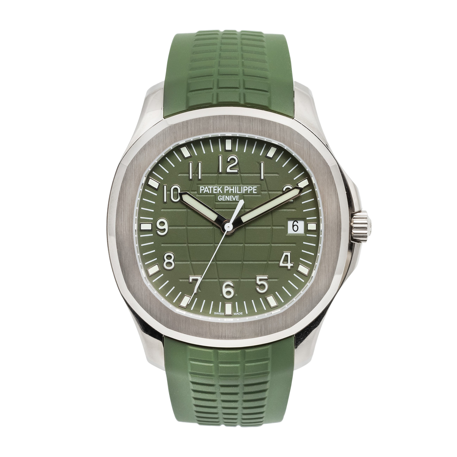 The watch is paired with a matching green tropical composite strap—resistant to wear, saltwater, and UV exposure—secured by an 18ct white gold fold-over clasp. Water-resistant to 120 meters, the Aquanaut 5168G-010 embodies contemporary elegance and technical precision, making it equally suited for everyday wear or adventurous pursuits.