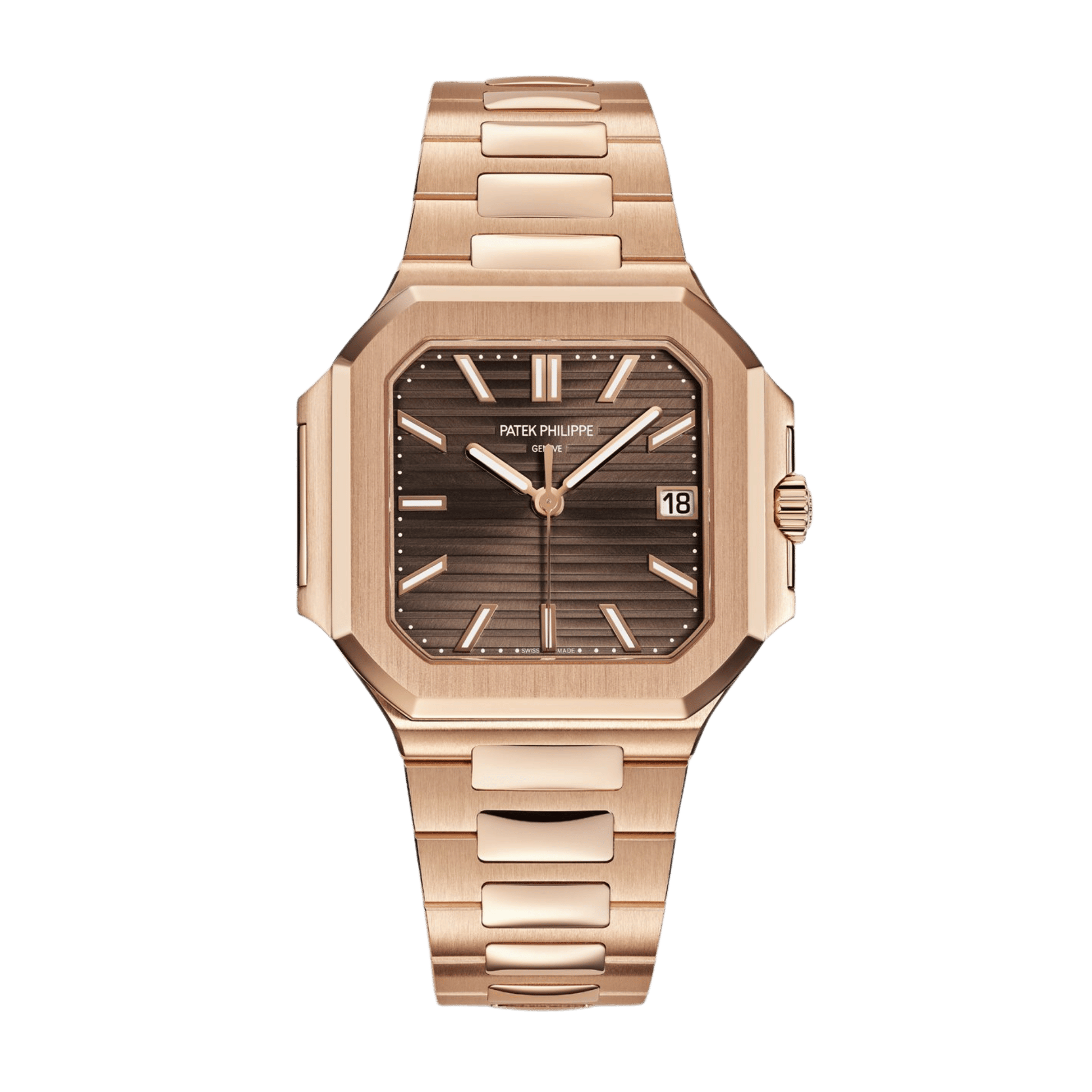 Water-resistant to 30 meters, the Cubitus Date ref. 7128/1R-001 embodies the evolution of Patek Philippe’s sport-luxury design language—combining geometric modernity, warm tones, and mechanical precision in a sophisticated yet versatile format.