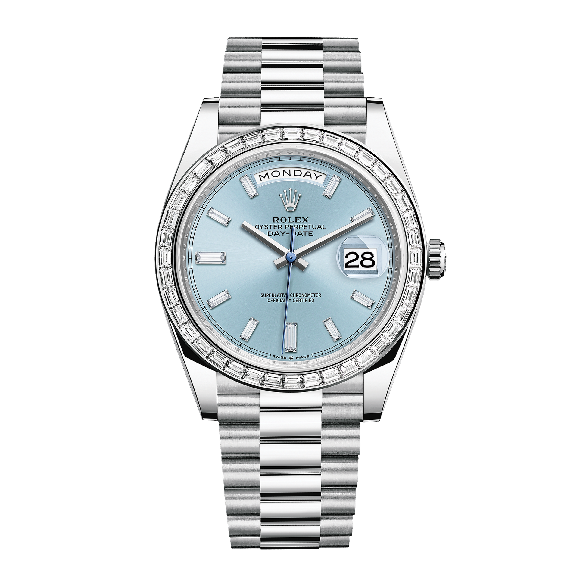 The Rolex Day-Date 40 ref. 228396TBR is crafted from platinum and features a 40mm Oyster case with a diamond-set bezel that enhances its refined appearance. The ice blue dial, exclusive to platinum Rolex models, includes brilliant-cut diamond hour markers along with the signature day display at 12 o’clock and date window at 3 o’clock.