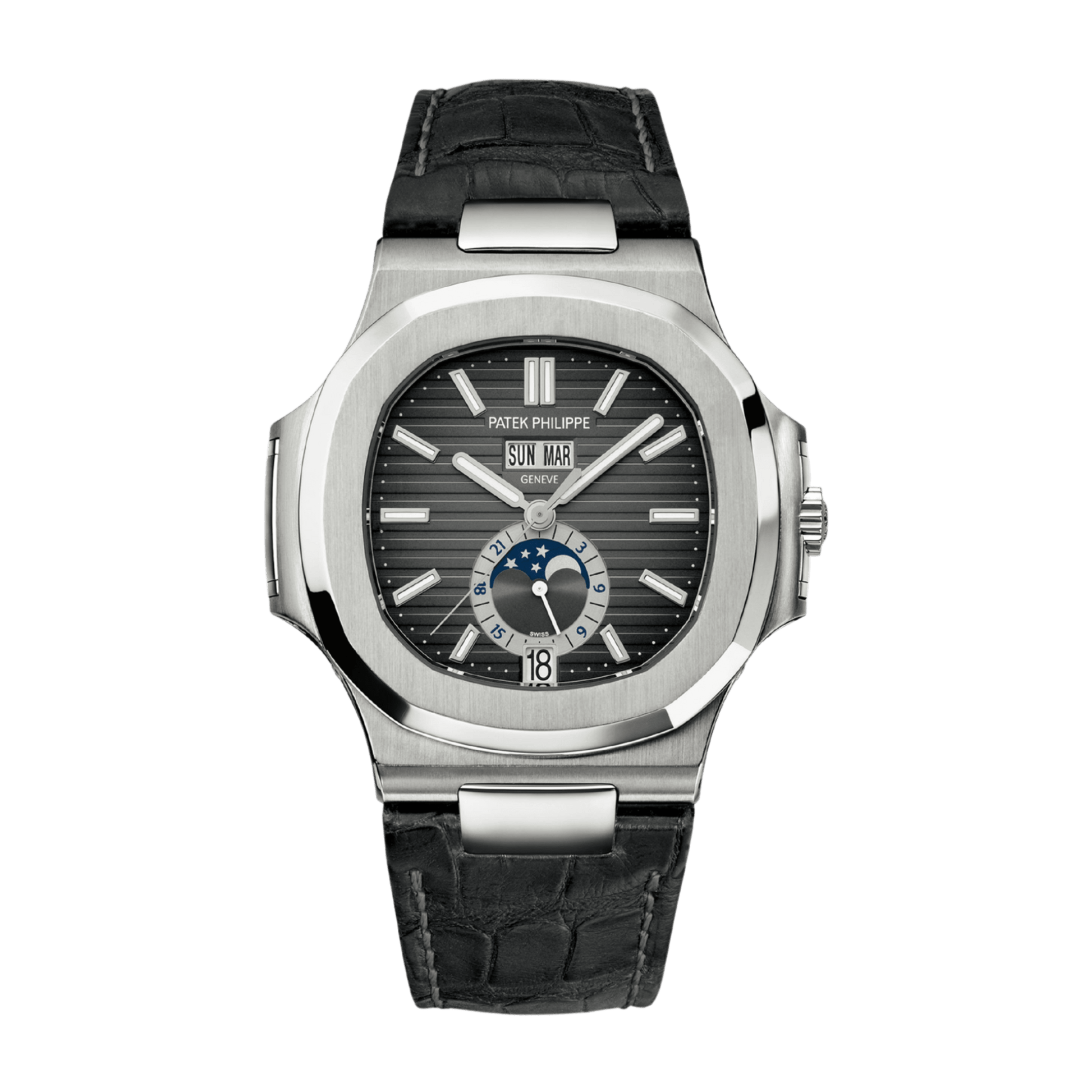 Fitted with a stainless steel bracelet and folding clasp, the Nautilus Annual Calendar ref. 5726A-001 delivers both comfort and enduring sophistication. Water-resistant to 120 meters, it exemplifies Patek Philippe’s ability to merge contemporary practicality with the timeless craftsmanship that defines the Nautilus collection.