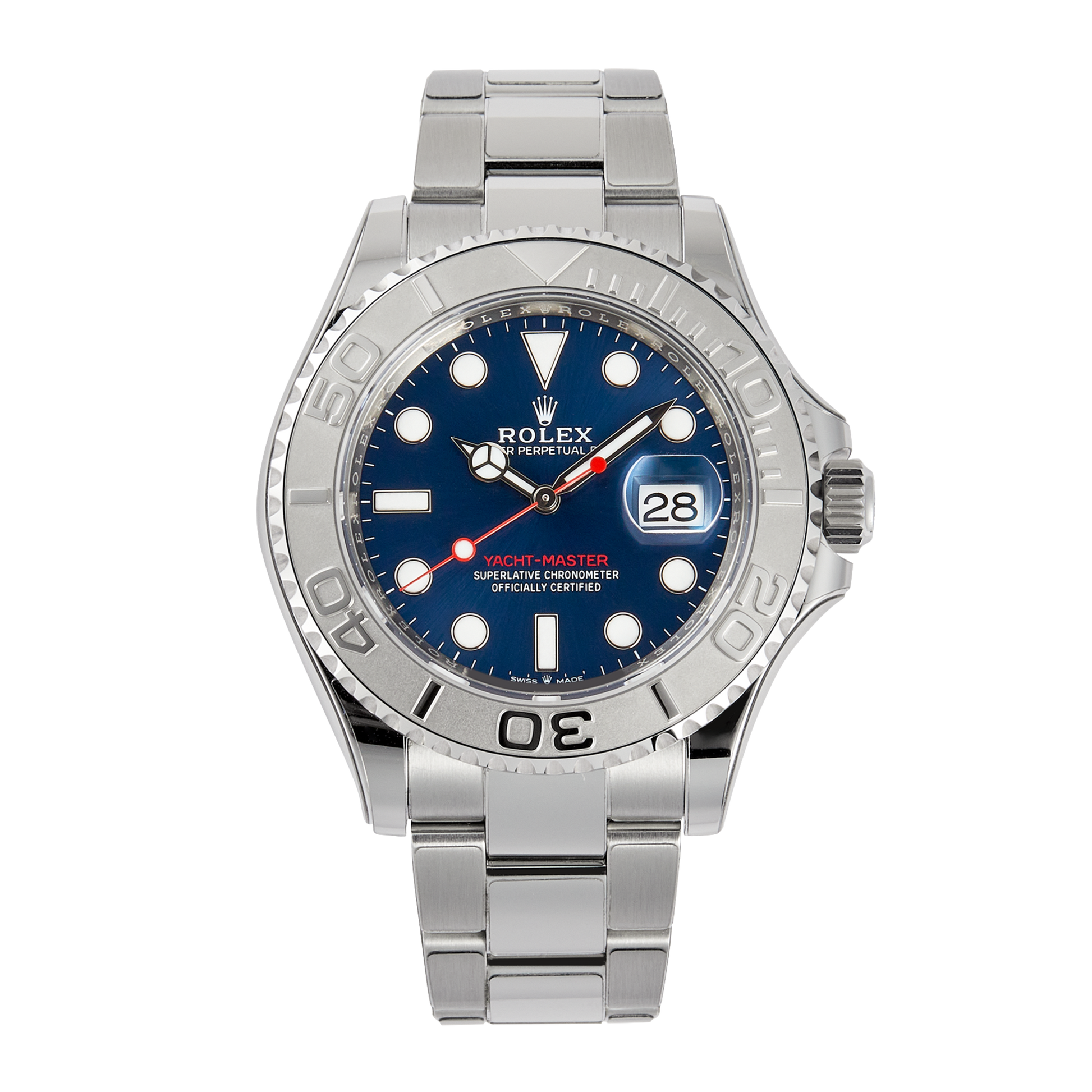 The Rolex Yacht-Master combines sport-oriented design with refined craftsmanship. This model features a blue dial and a bidirectional platinum bezel, offering a distinct contrast against its Oystersteel case and bracelet. Powered by a self-winding movement with a 70-hour power reserve, the watch maintains precision and reliability in any setting.